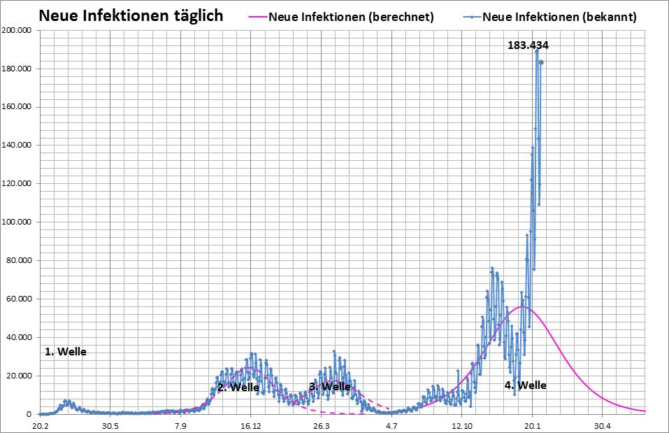 Das Hoch der 4. Welle (Wendepunkt in Diagramm3) wird Ende Dezember 2021 mit ca. 56.000 täglichen Infektionen erreicht werden.